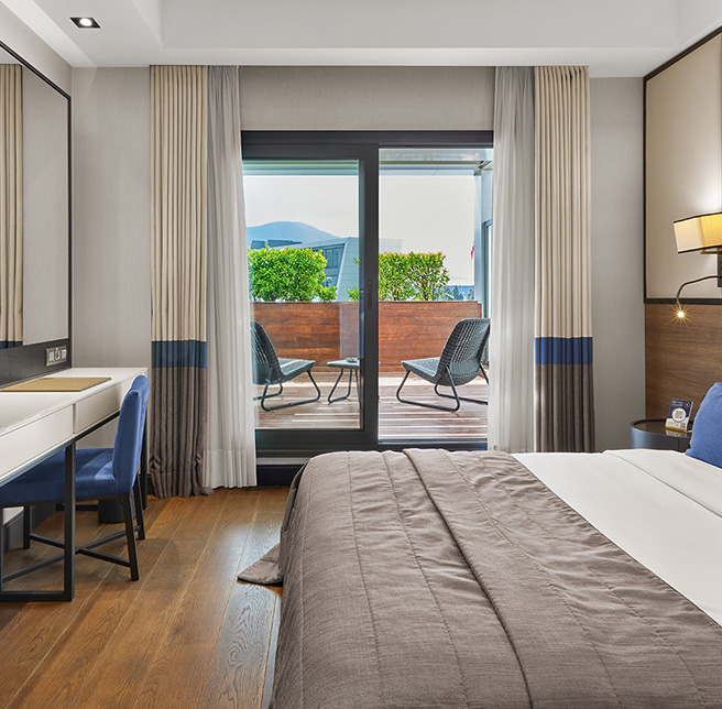 Lüks ve modern tasarımıyla seyahatinizi farklı bir boyuta taşıyan Teraslı Deluxe Odalar, özel teraslarıyla unutulmaz bir konaklama deneyimi sunuyor.